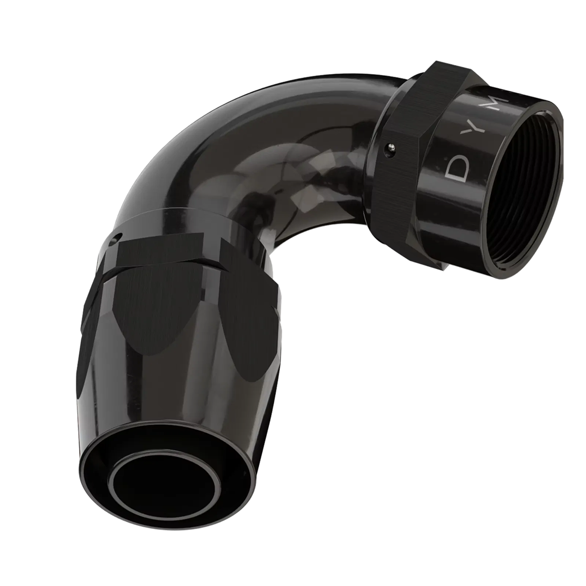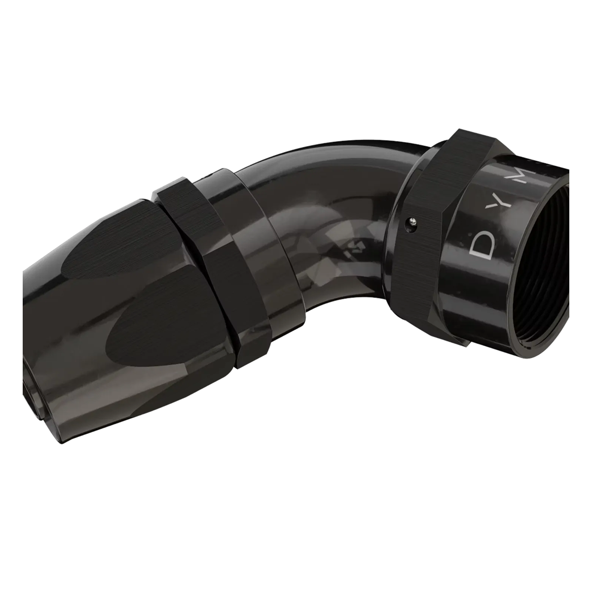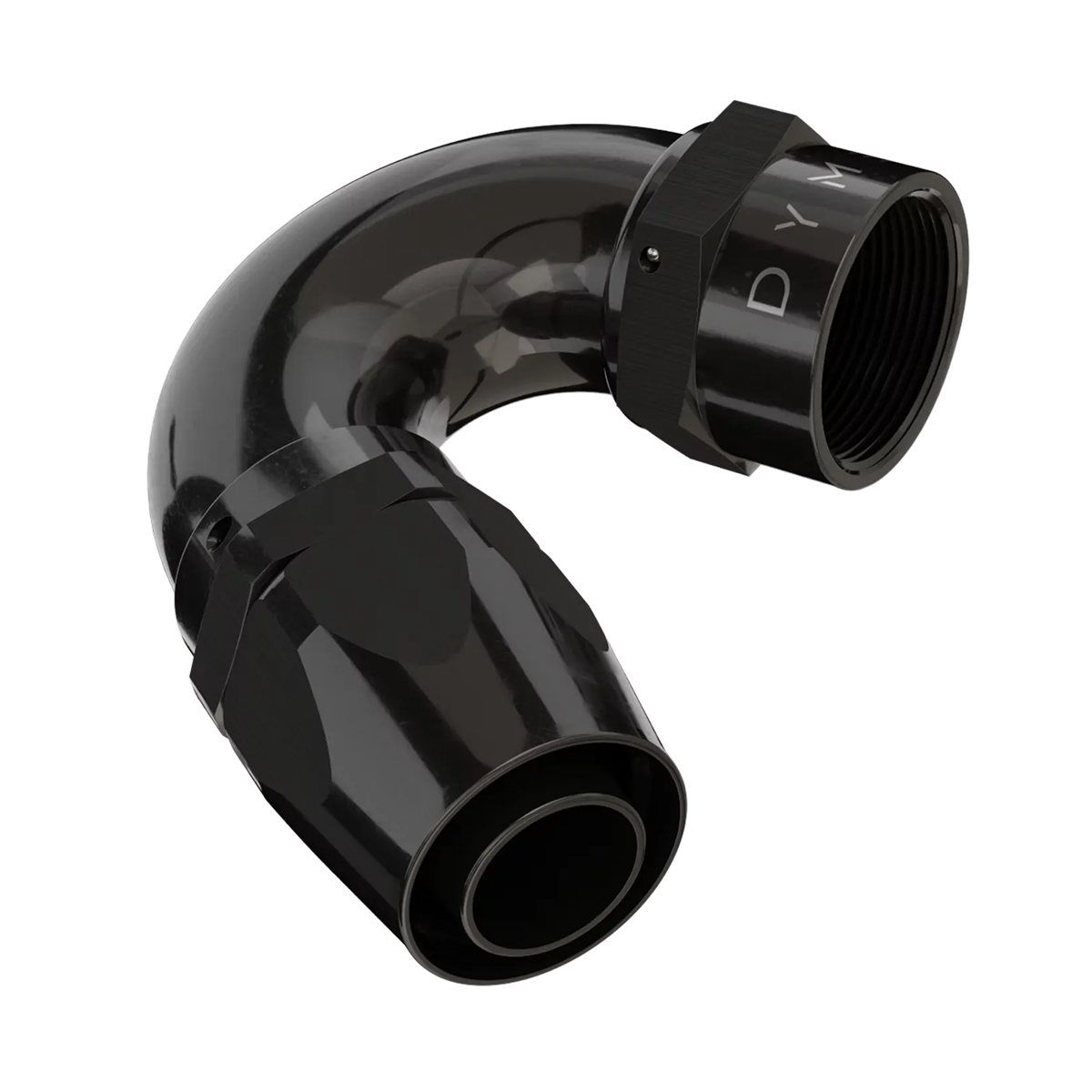 B-TYPE FATBOY AN/JIC 1-PIECE THICK TUBE, NO WELD, REUSABLE FITTING, WITH DUAL SEAL FKM SWIVEL ANGLE ADJUSTMENT, COMPATIBLE WITH SUPERSTRASSE CPE (REUSABLE TYPE) RUBBER HOSE TYPES, ANGLES STRAIGHT THROUGH 180 DEGREE. 6061-T6 BILLET ALUMINUM, BLACK ANODIZED BODY.